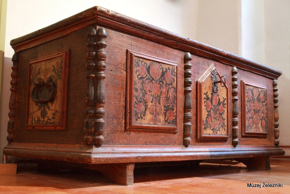 V muzeju, poleg te, hranimo še tri poslikane skrinje. Ta je, sodeč po letnici na njeni čelni strani, najstarejša. Zadnji lastnik, preden so jo leta 1965 odkupili za muzejsko zbirko, je bil Štefan Zupanc, Lokačev iz Železnikov. Delavnice, kjer je bila skrinja izdelana, ne moremo natančno določiti, predvidevam pa, da je izdelek ene domačih mizarskih delavnic. Prav tako so kovinske dele skrinje verjetno izdelali lokalni kovači in ključavničarji. Gre za tipično poslikano skrinjo 19. stoletja. Na čelni končnici ima tri z letvicami okvirjena polja s cvetličnimi motivi (motiva cvetličnega šopka v vazi in samostojnega šopka), ki so med seboj ločena s struženima stebroma. Na osrednjem polju, ob ključavnici in nad šopkom, je letnica 1800. Na obeh stranskih končnicah je prav tako v okviru naslikan dvoglavi heraldični orel. Zadnja končnica ni poslikana.
