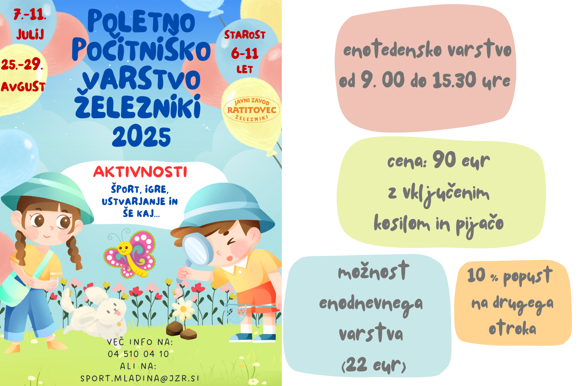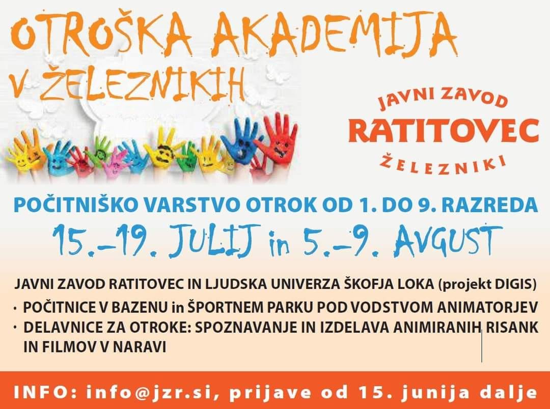 Prijave za počitniško varstvo v organizaciji Javnega zavoda Ratitovec se bodo začele zbirati junija in bodo elektronske. Varstvo bo organizirano v juliju 7.7. do 11.7 in pa še v avgustu 25.8 do 29.8. Več informacij dobite na telefonu 04 510 04 10.