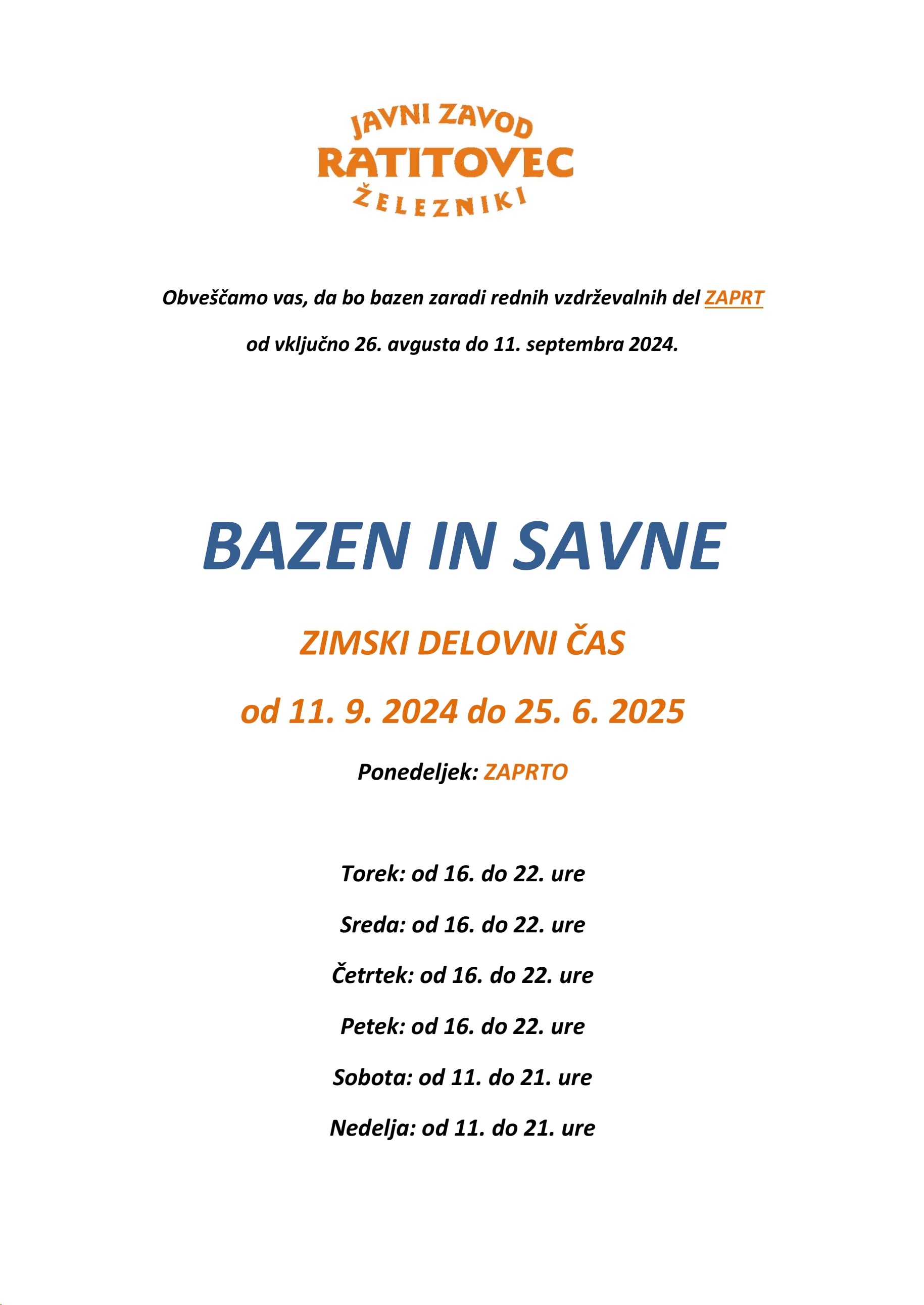 Osveženi, preurejeni po rednih letnih vzdrževalnih delih na bazenu se za vas vračamo in vas vabimo k obisku našega bazena v sredo 11. 9. 2024 od 16. ure dalje.