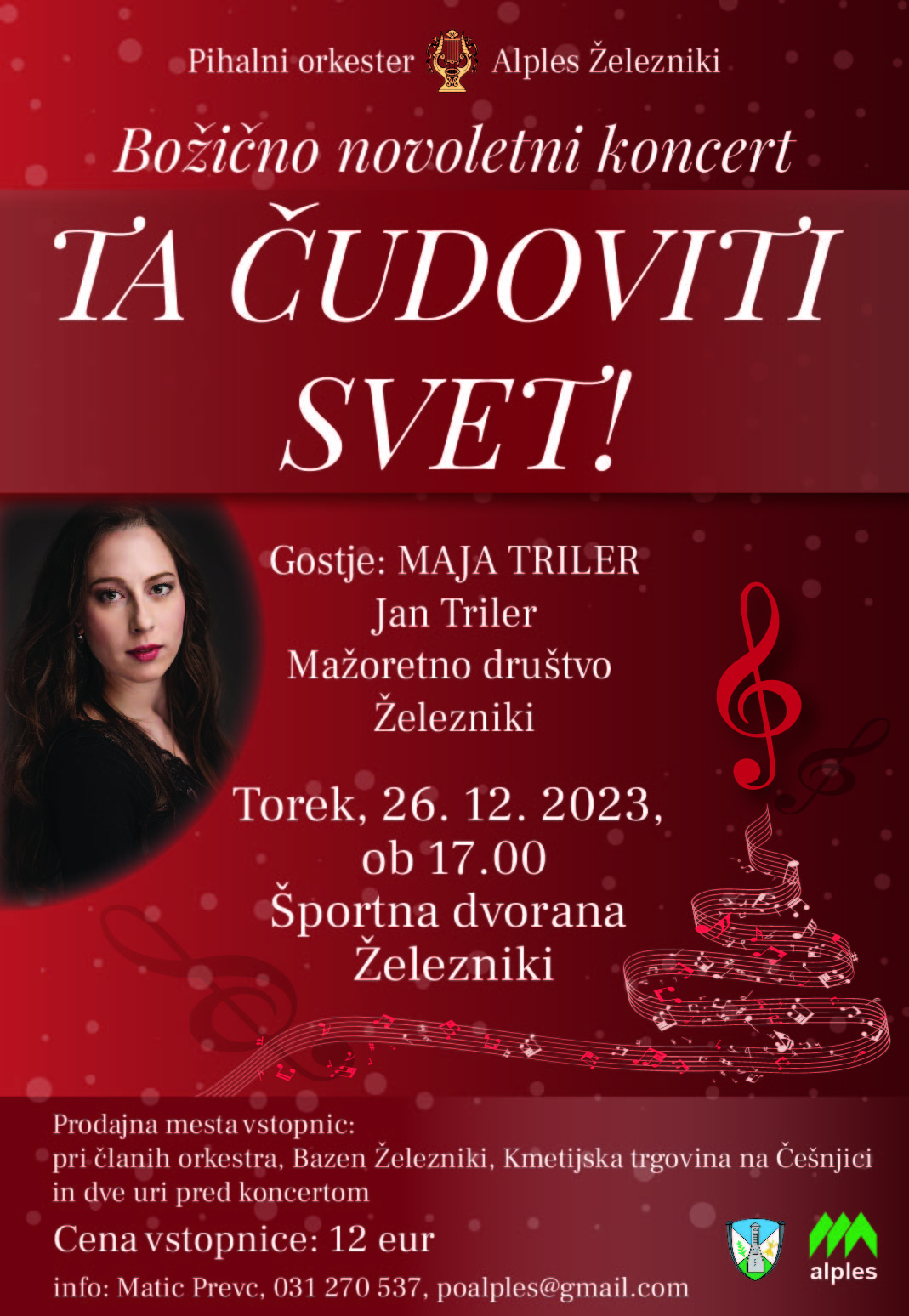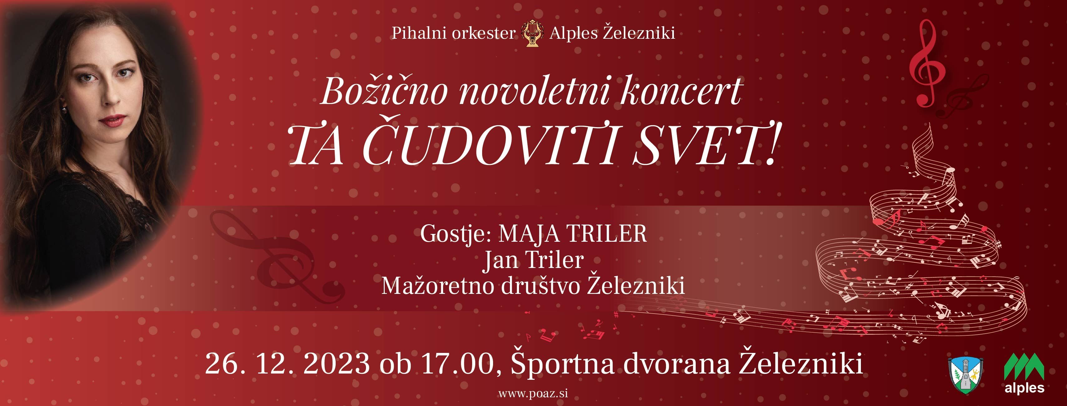 Pihalni orkester Alples Železniki že tradiocionalno prireja Božično-novoletni koncert katerega glavna gostja bo pevka Maja Triler, predstavili pa se nam bodo tudi Jan Triler in mažoretke. Lepo vabljen