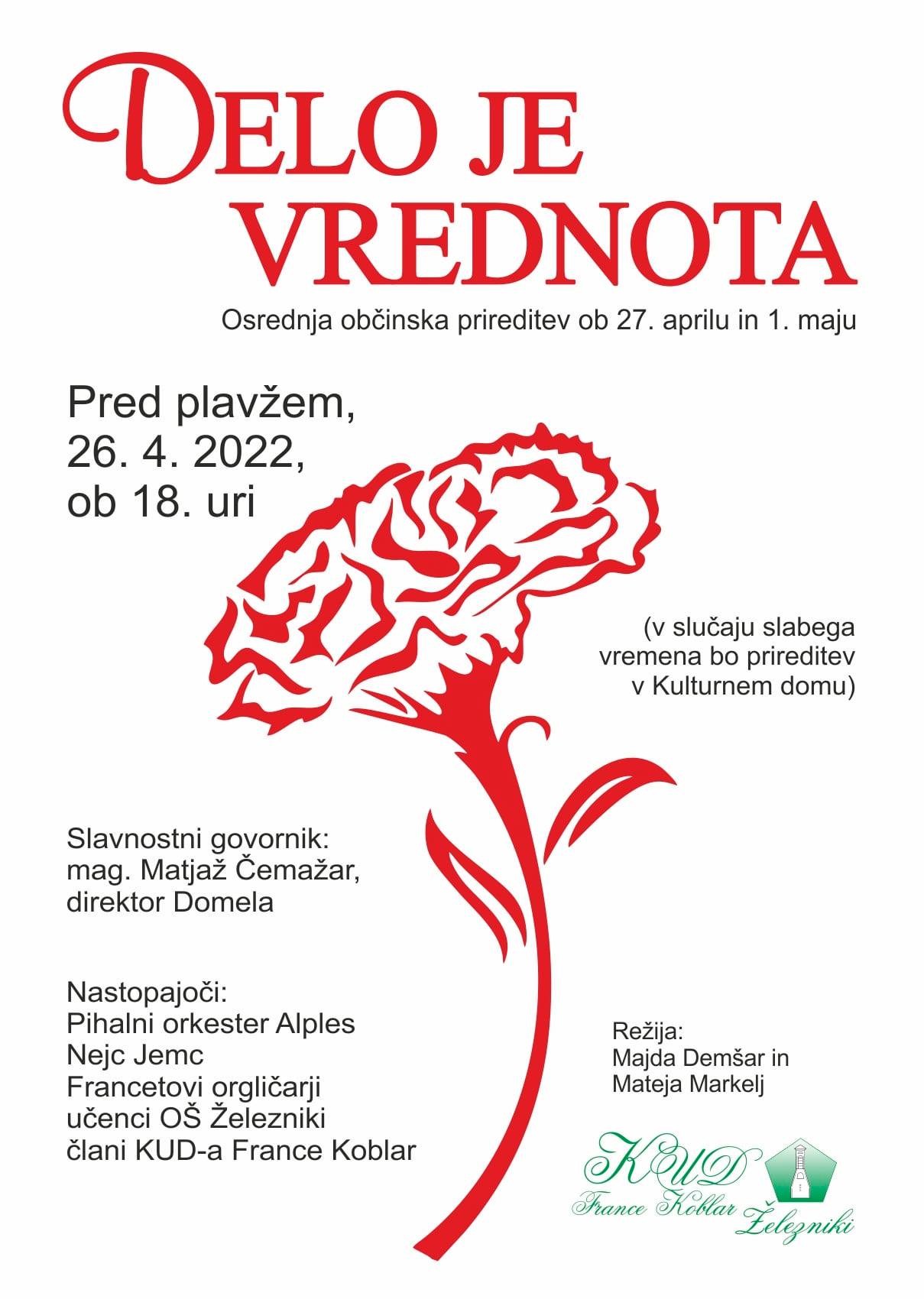 Osrednja občinska prireditev ob 27. aprilu in 1. maju bo v torek, 26. aprila 2022, ob 18. uri na trgu pred plavžem v Železnikih.