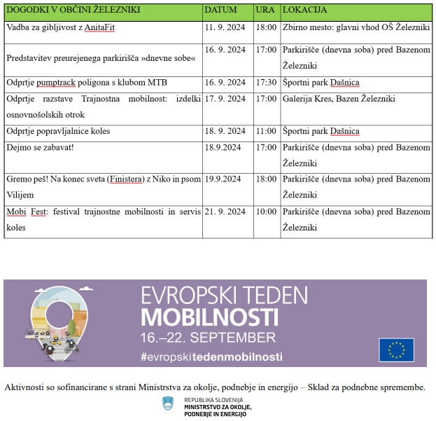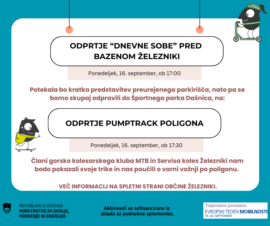 Parkirišče pred bazenom bomo v sklopu Evropskega tedna mobilnosti za sedem dni preuredili v »dnevno sobo«, ki bo namenjena druženju, ustvarjanju in izvedbi dogodkov. Vabljeni na njeno predstavitev v ponedeljek, 16. 9. 2024, ob 17. uri.Po predstavitvi (predvidoma ob 17.30 uri) se bomo peš odpravili na odprtje pumptrack poligona, kjer nas bodo čakali člani MTB-ja in Servisa koles Železniki. Pokazali nam bodo svoje spretnosti in trike ter nas poučili o zaščitni opremi in varni vožnji.