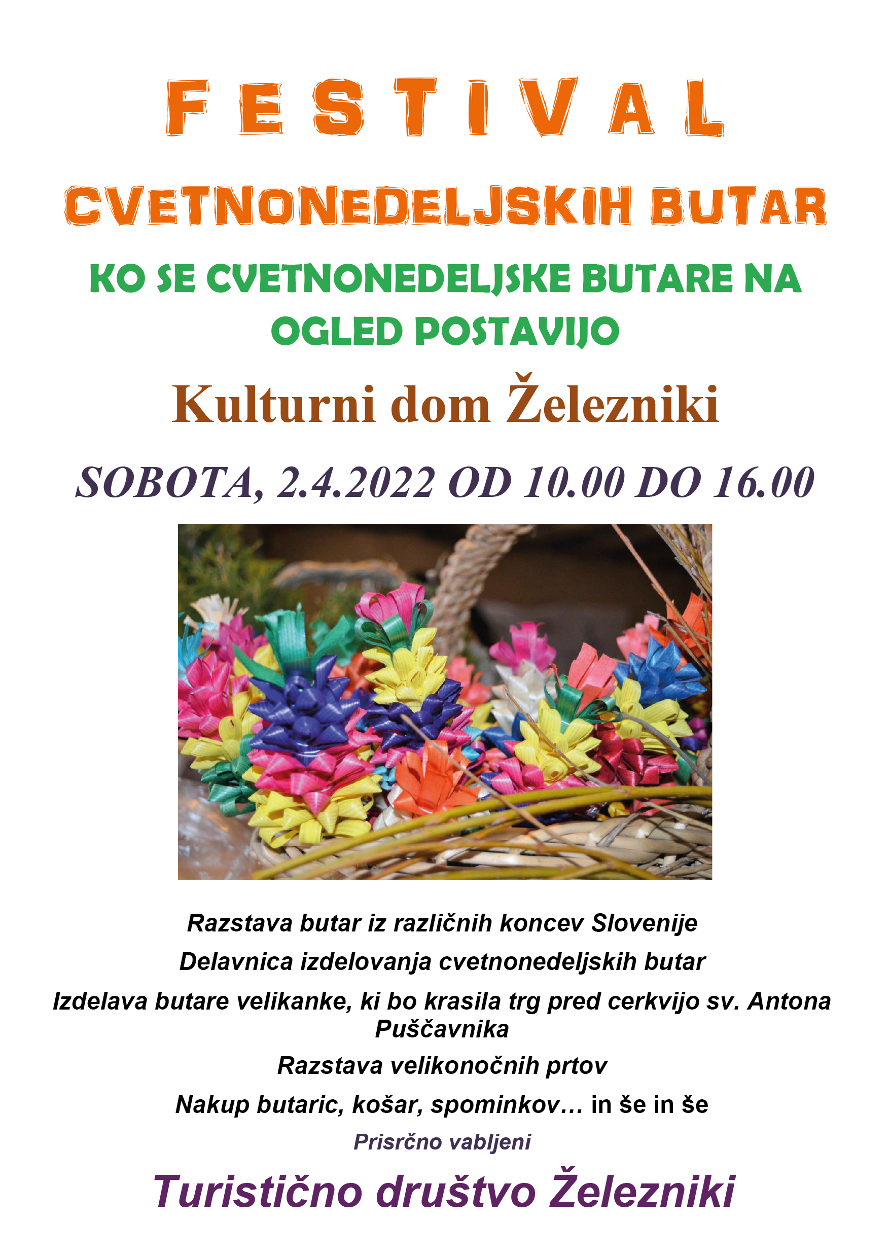 Turistično društvo Železniki, vas v soboto, 2. aprila 2022, vabi na Festival cvetnonedeljskih butar, ki bo od 10. do 16. ure v Kulturnem domu Železniki.