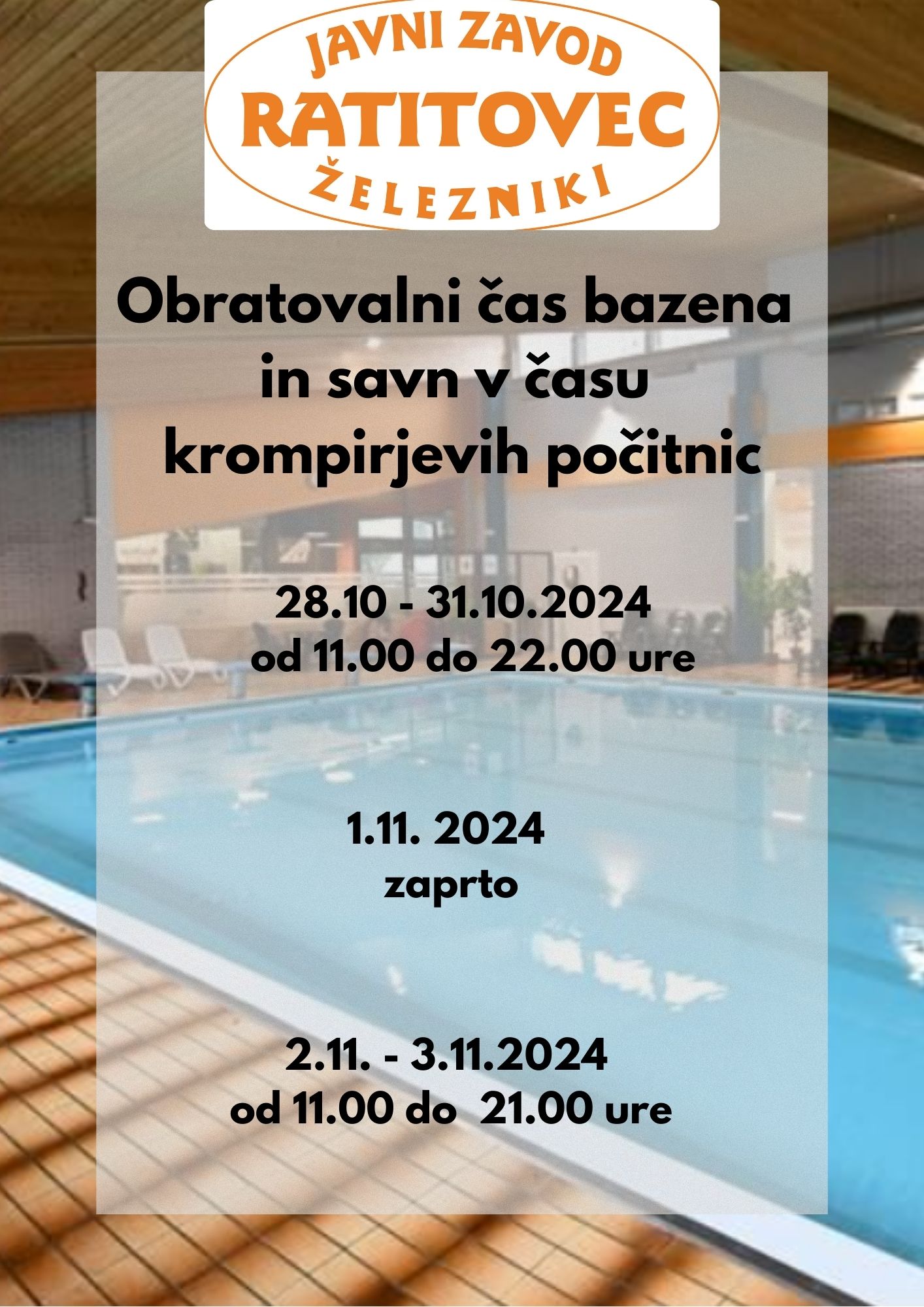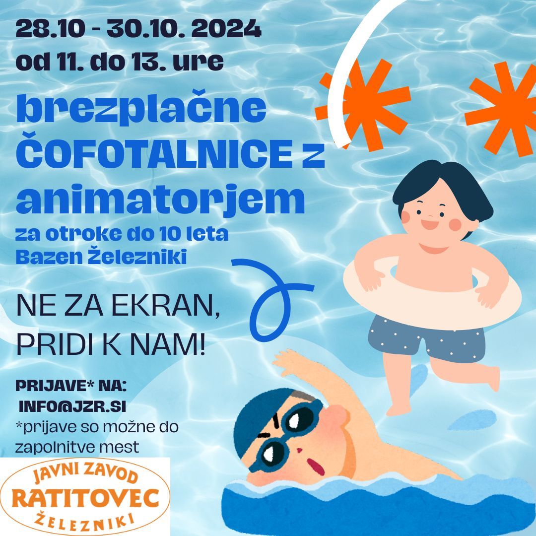 V času krompirjevih počitnic Javni Zavod Ratitovec vabi vse otroke do 10. leta starosti na brezplačne Čofotalnice z animatorjem v Bazenu Železniki od 11. do 13. ure (prijave obvezne, zbor v avli pred bazenom), starši pa ste vabljeni na sproščen oddih v svetu savn. Na voljo so: finska savna, infra rdeča savna, bio savna.