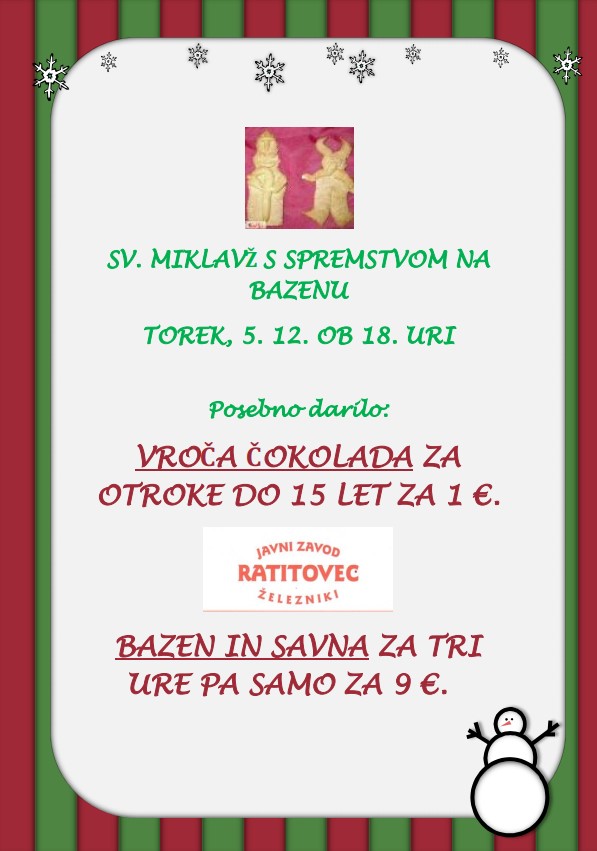Miklavž s spremstvom bo obiskal otroke v Bifeju bazen Železniki, v torek, 5. decembra 2023, ob 18. uri.