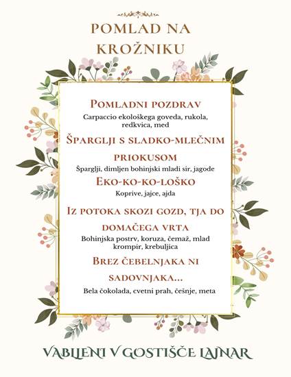 3. maja 2023 ob 18. uri v gostišču Lajnar na Soriški planini pripravljajo prav poseben kulinarični večer, ki so ga poimenovali kar »POMLAD NA KROŽNIKU«. Chef Luka Čufar je oblikoval prav poseben meni