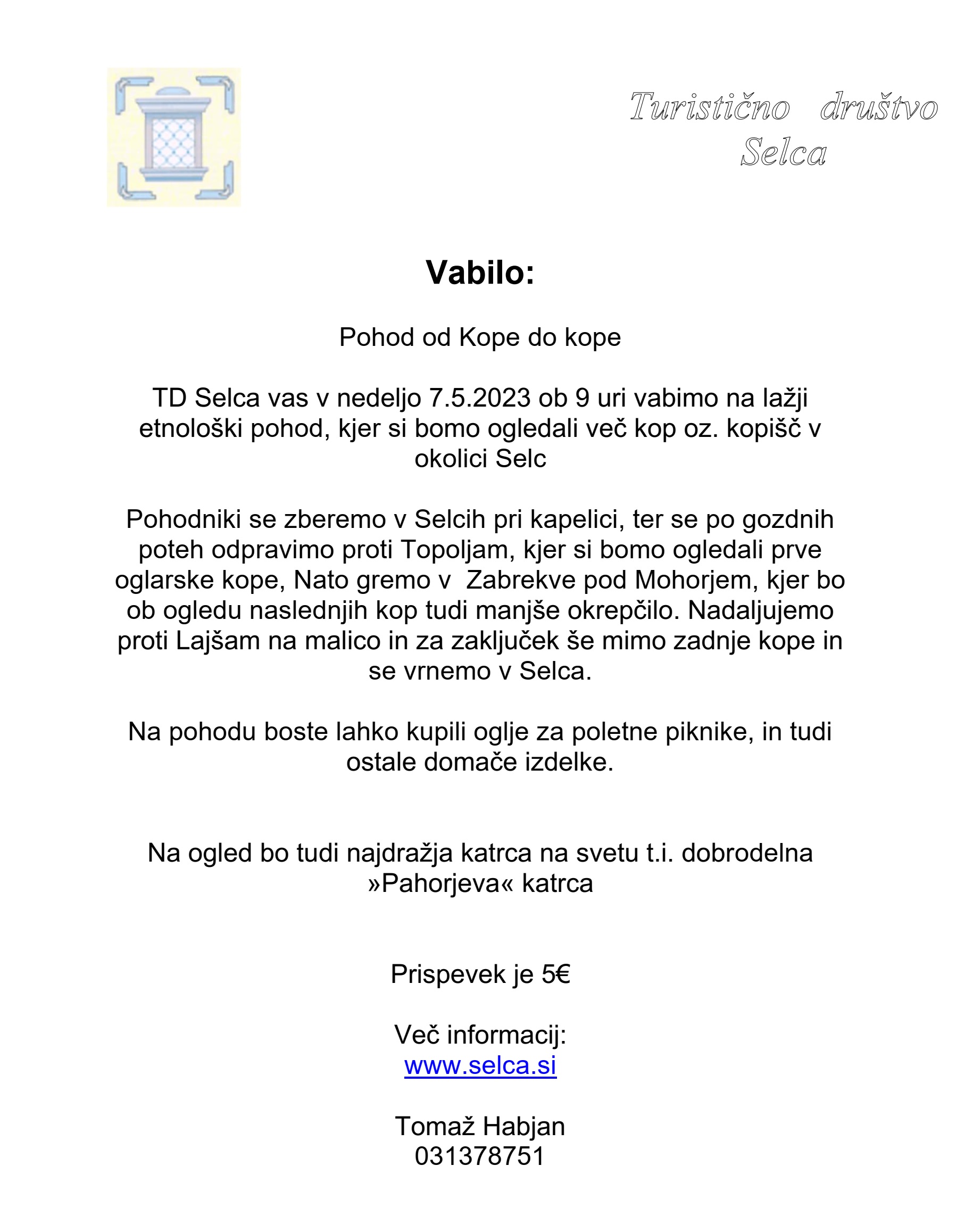 TD Selca vas v nedeljo, 7. maja vabi na etnološki pohod od kope do kope.