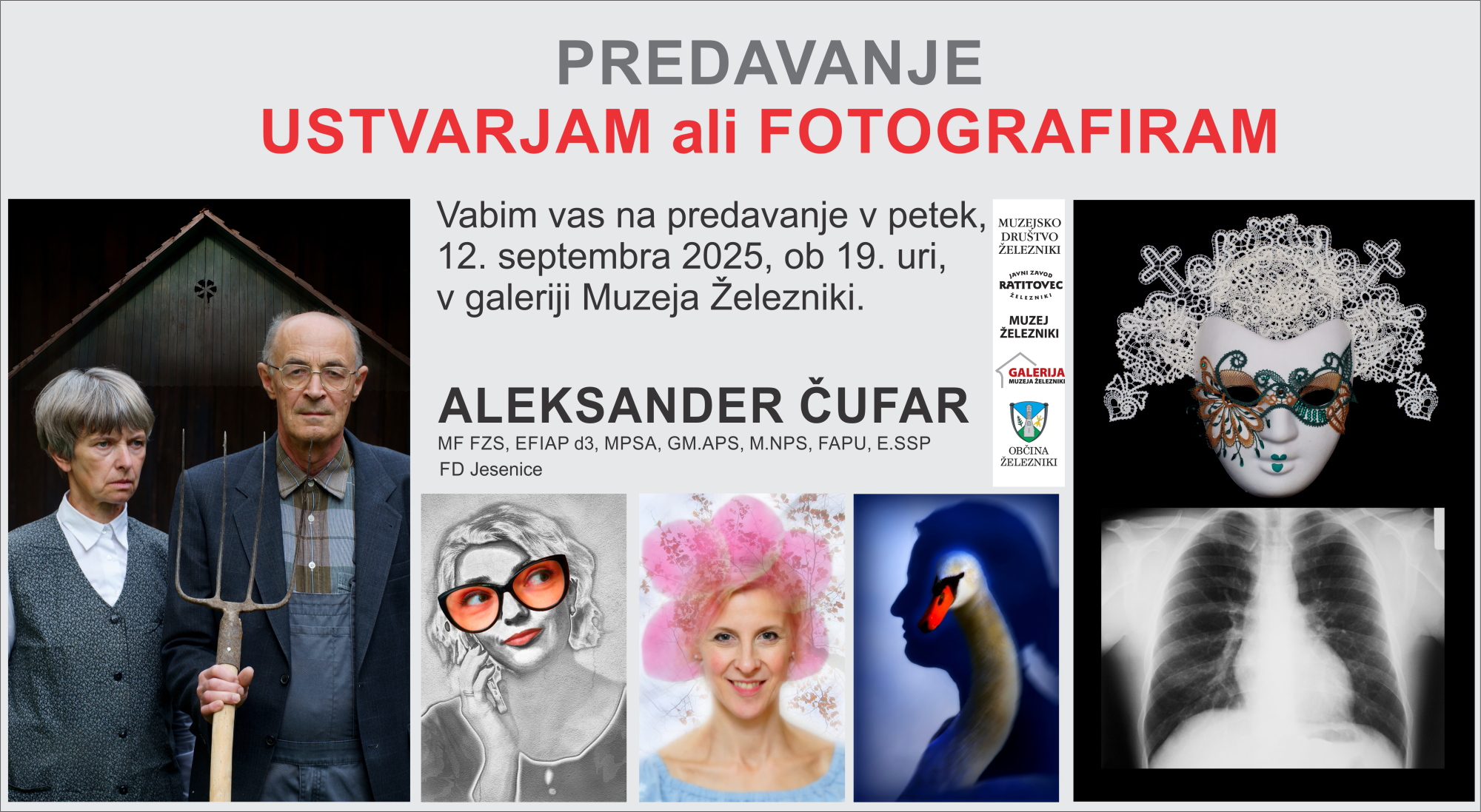 Vabljeni na predavanje Aleksandra Čufra Ustvarjam ali fotografiram, ki bo v galeriji Muzeja Železniki v petek, 12. septembra 2025, ob 19.00