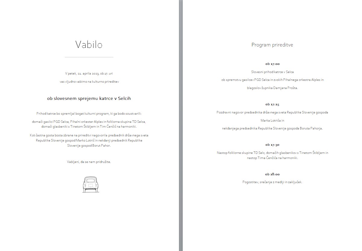V petek, 21. aprila 2023, ob 17. uri vas vljudno vabimo na kulturno prireditev ob slovesnem sprejemu katrce v Selcih