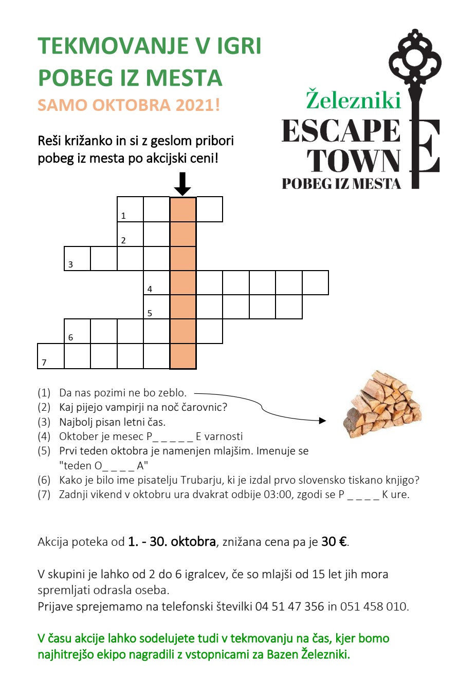 V oktobru praznujemo teden otroka in v tem mesecu bo potekalo tekmovanje v igri Pobeg iz mesta Železniki. Tekmovanje je namenjeno predvsem srednješolcem in družinam. Najboljša skupina bo za nagrado prejela skupinsko karto za bazen. Tekmovanje poteka od 1. do 30. oktobra, znižana cena pa je 30 evrov. V skupini je lahko od 2 do 6 igralcev, če so mlajši od 15 let jih mora spremljati odrasla oseba. Prijave sprejemamo na telefonski številki 04 51 47 356 in 051 458 010.