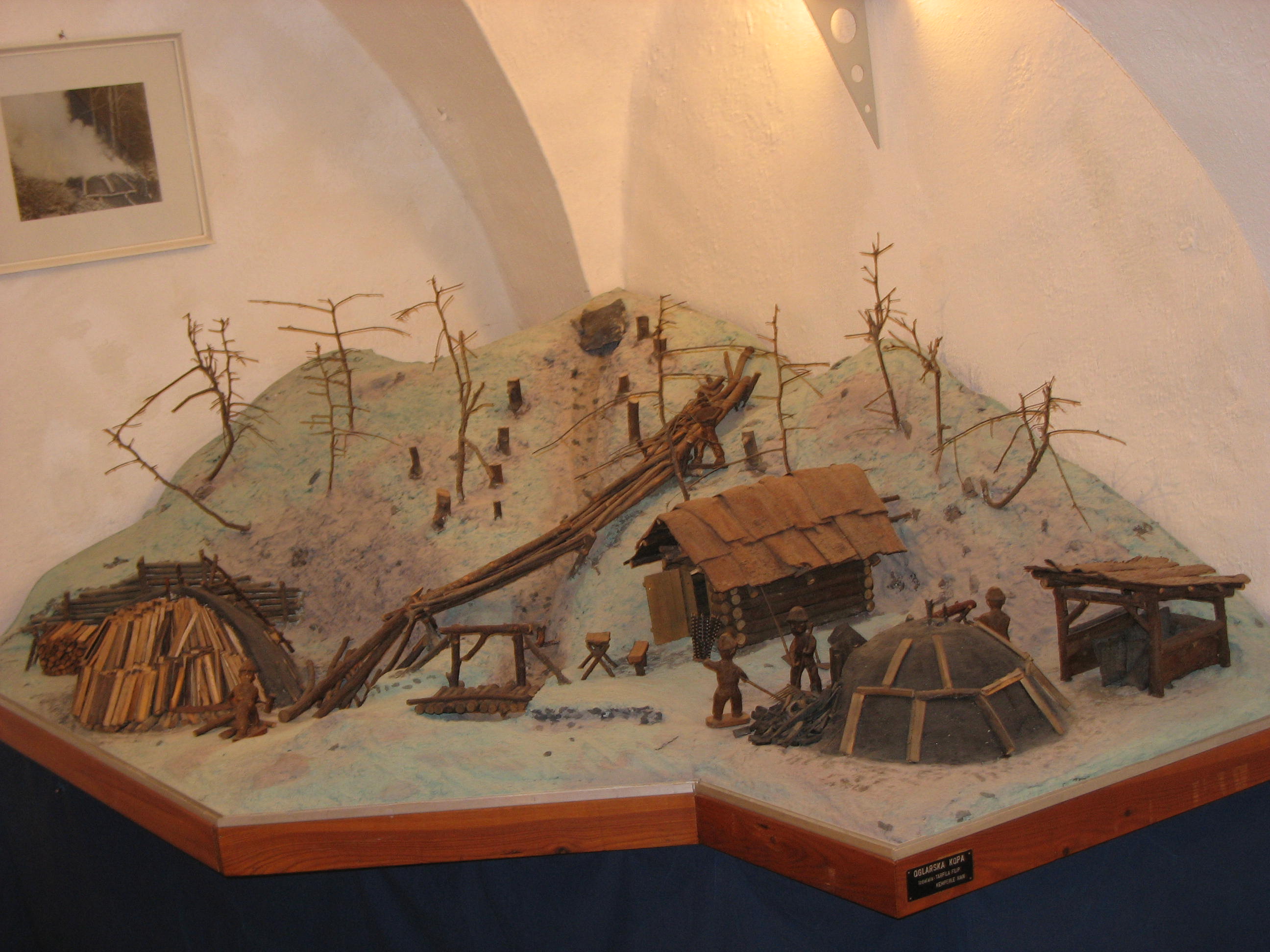 Oglje je bilo glavno kurivo za kurjenje plavža in ognjišč. Preprosta maketa prikazuje vse faze od priprave lesa do podiranja kope in shranjevanja oglja. |