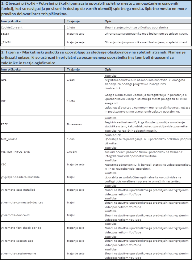 · za uporabniku prijazno spletno izkušnjo in prilagajanje operacij spletnih aplikacij vašim potrebam lahko nekatera področja našega spletnega mesta uporabljajo piškotke. Piškotek je datoteka, ki shrani nastavitve spletnih strani v vaše naprave, s katerimi dostopate do interneta z namenom prepoznavanja posameznih naprav in nastavitev pri dostopu. Piškotki omogočajo spletnim stranem prepoznavanje, če je uporabnik že obiskal to spletno mesto in pri naprednih aplikacijah se lahko z njihovo pomočjo ustrezno prilagodijo posamezne nastavitve. Njihovo shranjevanje je pod popolnim nadzorom brskalnika, ki ga uporablja uporabnik - ta lahko shranjevanje piškotkov po želji omeji ali onemogoči.
