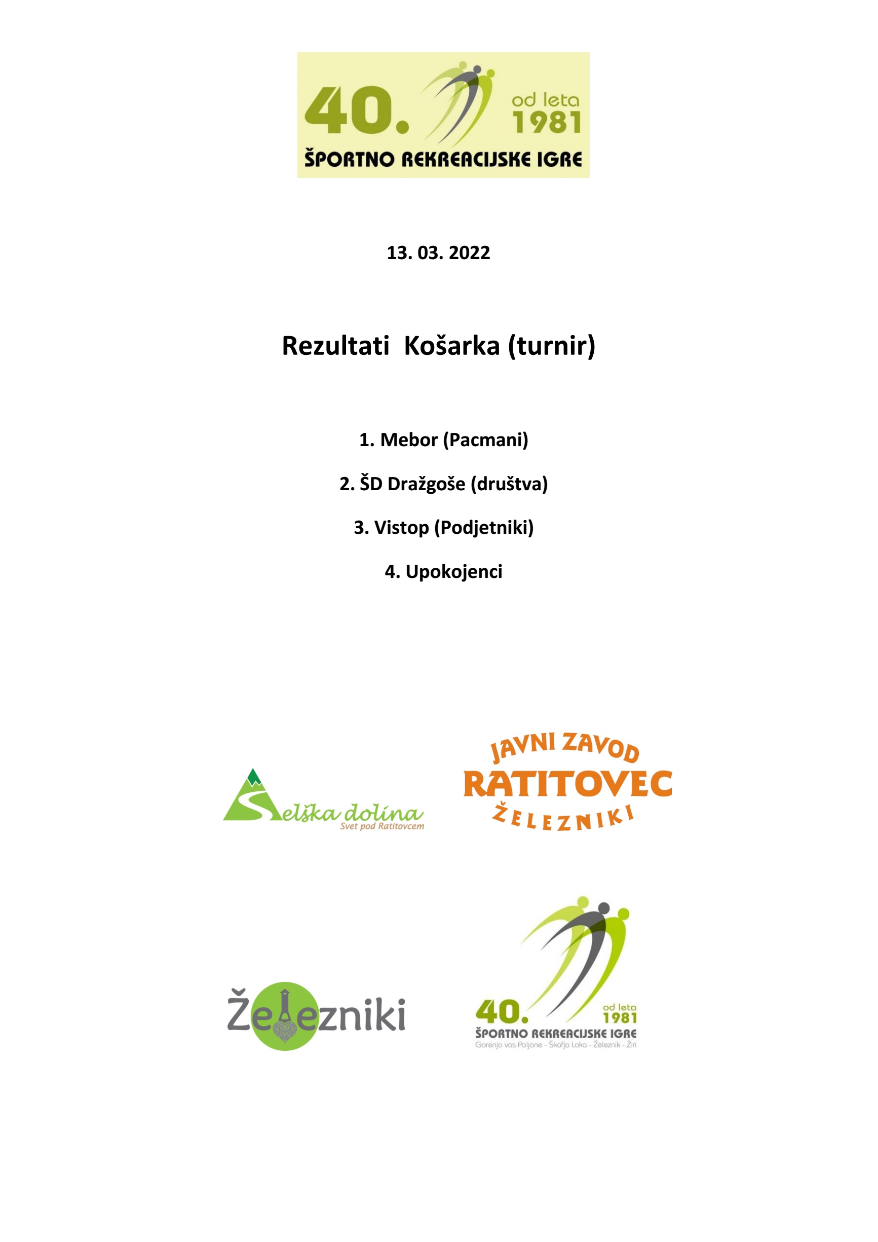 1.mesto Mebor Pacmani,, 2.m. Škorci, 3.m. ŠD Dražgoše, 4.m.Upokojenci