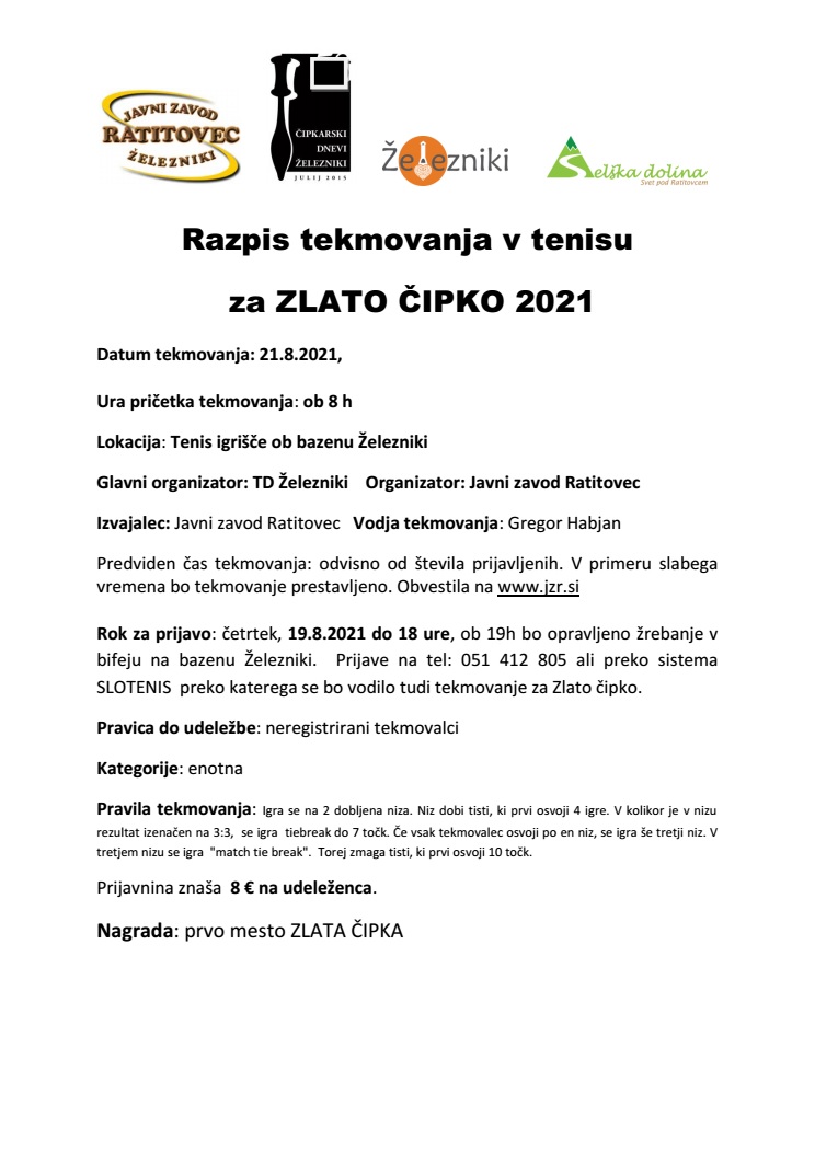 JZR - Tenis 17.9.2022 Cipkarski turnir TENIS 22 .pdf, Razpis tekmovanja tenis za ZLATO CIPKO 2022.pdf